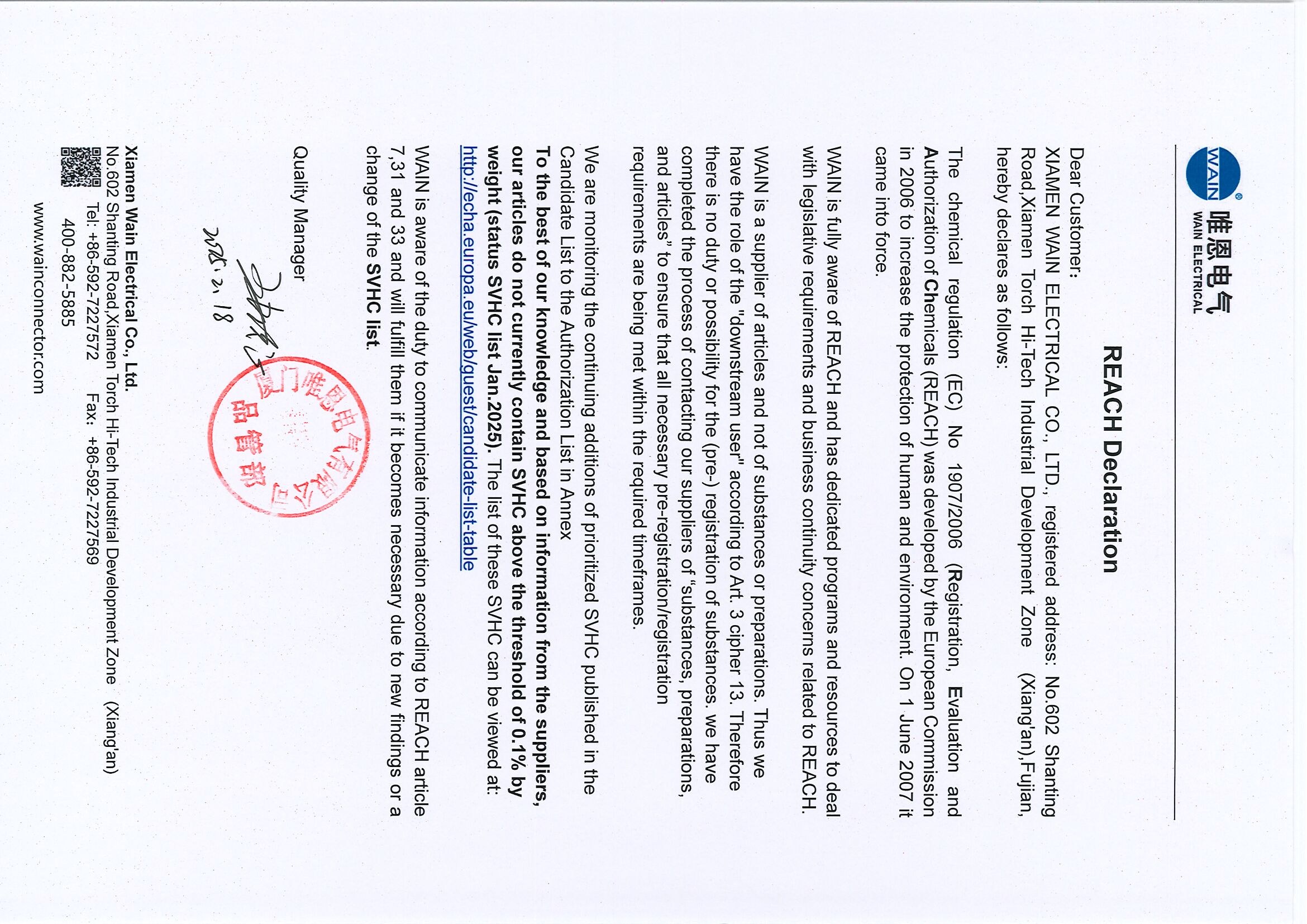 REACH 合规声明
