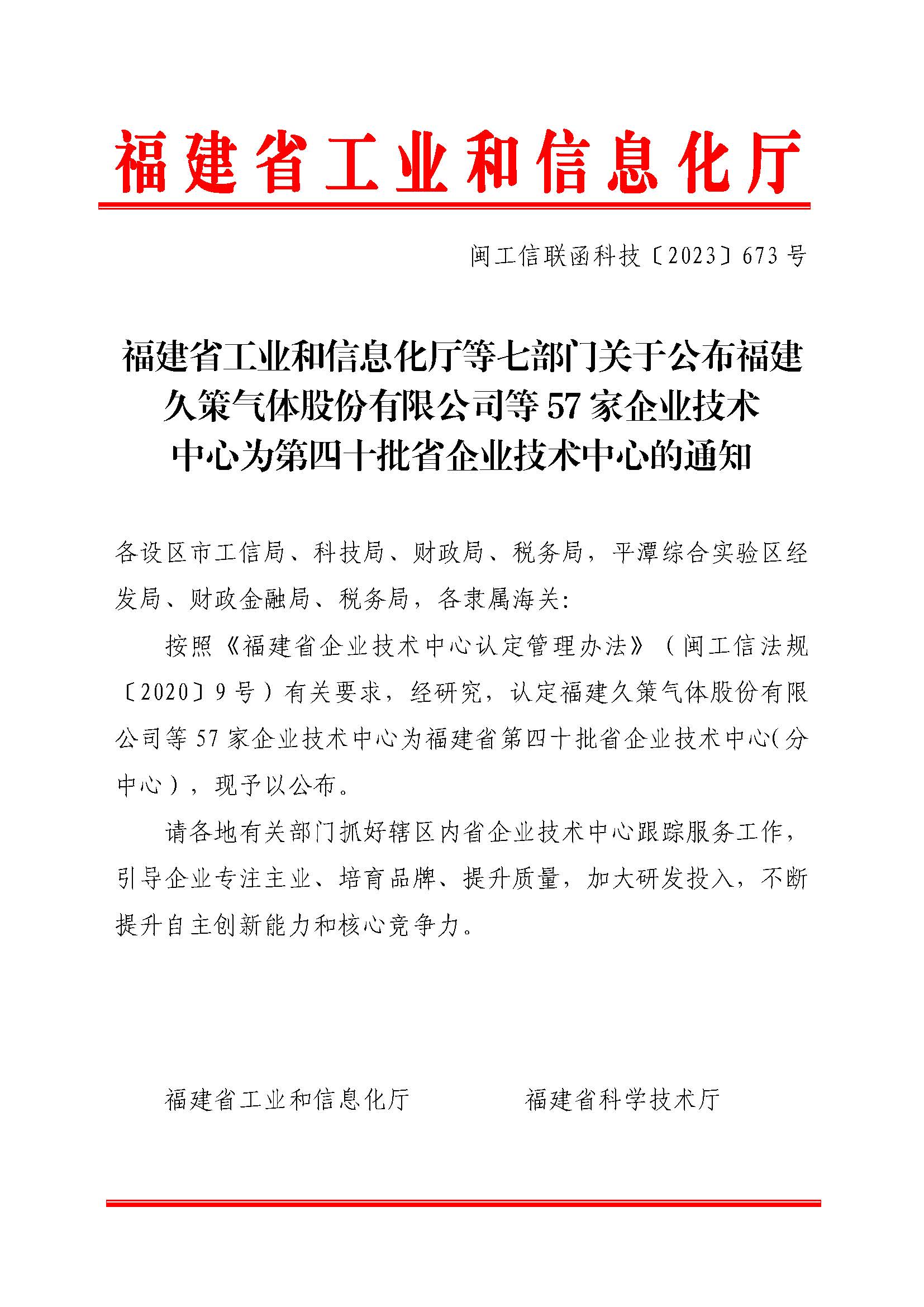 福建省工业和信息化厅等七部门关于公布福建久策气体股份有限公司等57家企业技术中心为第四十批省企业技术中心的通知