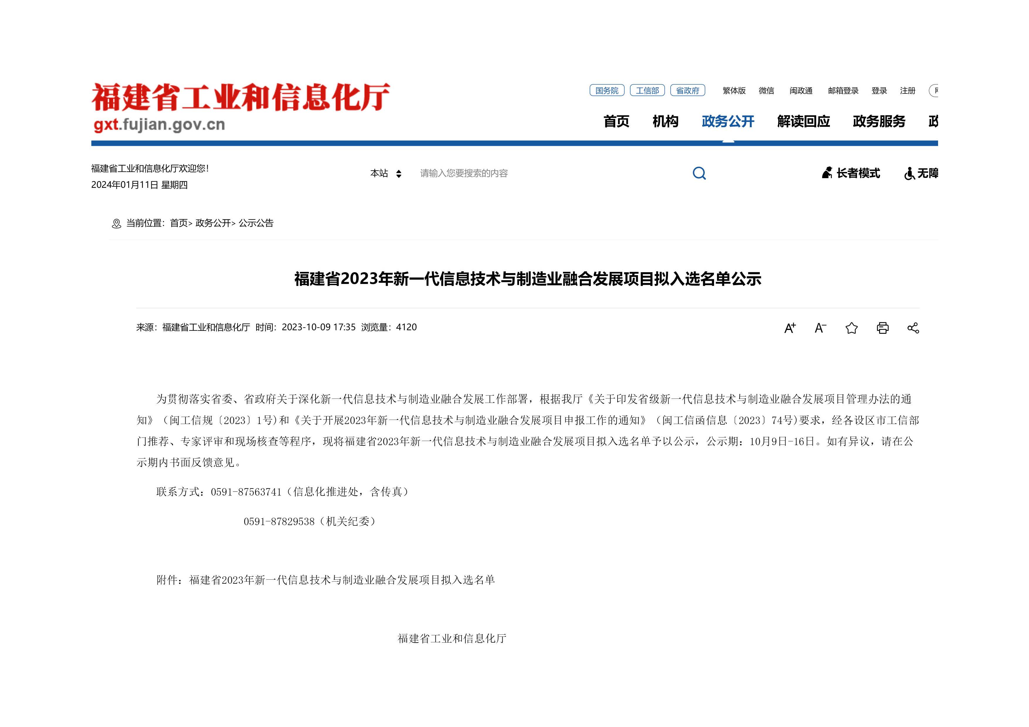福建省2023年新一代信息技术与制造业融合发展项目拟入选名单公示(序号37)