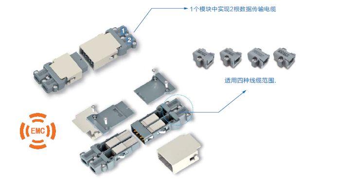 可以在一个模块中实现2根数据传输电缆的连接,360度屏蔽,使总线与外壳电位有效隔离。