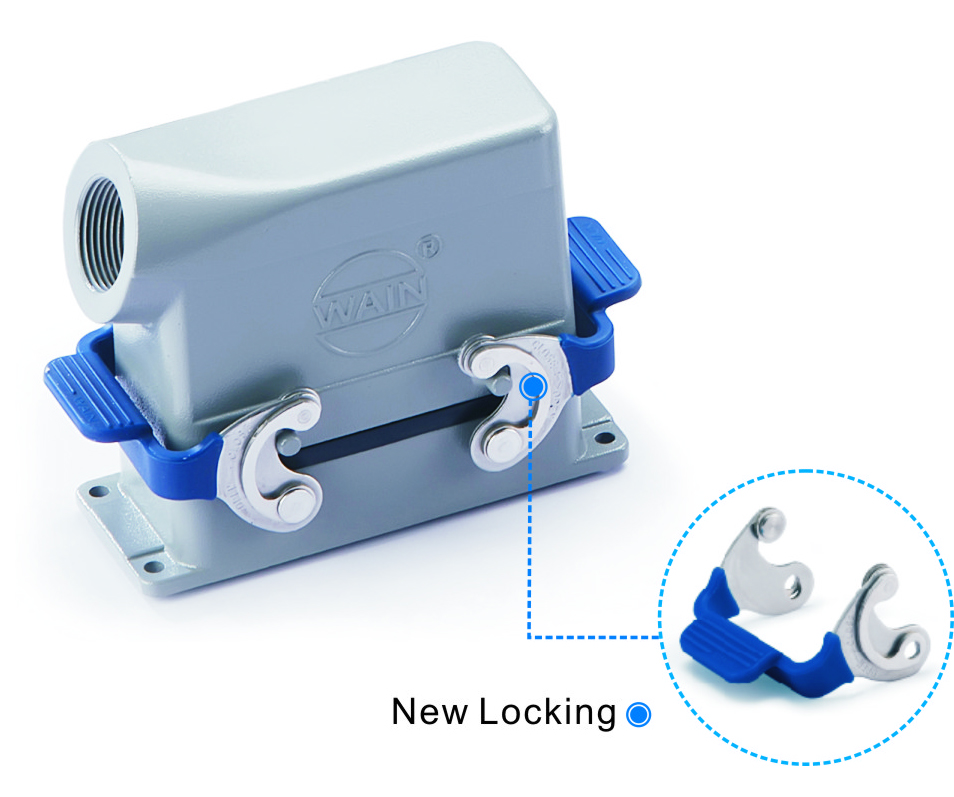 WAIN研发的SC系列锁扣装置,采用高强度不锈钢一体式设计,完全避免断裂的可能性,即使在恶劣的环境下长年使用,也可确保其功能完整。锁扣主体一体成型,且在主体两外侧设置弹性件用于锁紧插头与插座部分,弹性件采用月牙形弹性件,外观独特,结构巧妙;优质的NBR包胶材料,手柄部的手感更好;在锁扣的过程中滚轮结构能使之锁扣得更顺畅。一种连接器锁扣结构已取得实用新型专利,专利号为201420344473.9。作为7790CNM必发集团外壳锁扣装置,SC系列产品可广泛应用于轨道交通、电力控制柜等行业。