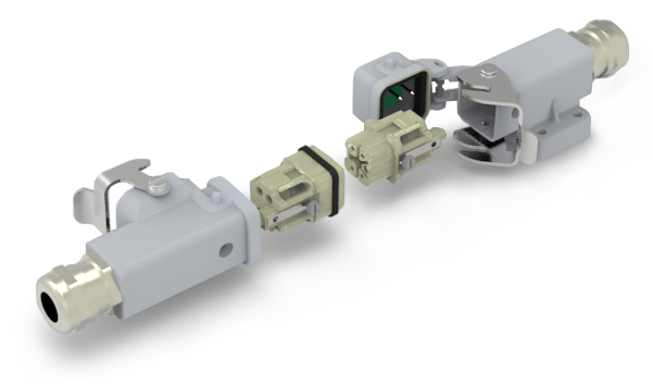 针对现有特殊工况,我司研发一种连接器柔性翻转护盖结构,无论连接器处于对接或分离状态,均能确外壳保护盖内不受污染。合盖过程中通过销轴移位切换,使护盖内插针与连接器芯体通孔顺畅插接。H3A-TE-2B-M20.XD;H3A-SF-1L/S-M20-MCV.XD连接器分离后自动短接切换到检修状态,其额定电流10A,额定电压250V,脉冲电压4KV,工作温度-40℃~+125℃,匹配铸锌外壳可达防护等级IP65。独特的护盖柔性翻转,使护盖插针插入对接底座更方便、快捷,抑制错位现象,而锁扣的自拆装设计,使插针底座插孔实现自动对接闭合及分离,具有结构合理、使用方便等优点。