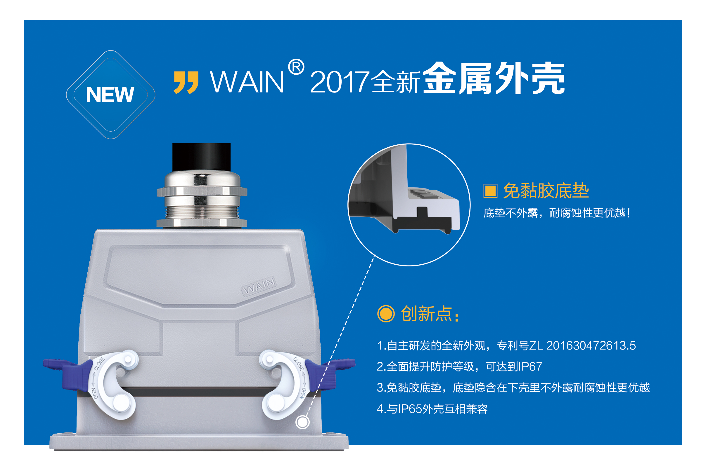 唯恩重载连接器系列将迎来新的成员:通过自主新型外观专利设计的WAIN连接器即将面世。 我们一直致力于提升WAIN连接器的质量水平以及客户体验。因此,我们重新设计了具有WAIN特色的新外观外壳。 新外壳的创新之处在于: 1:全新的外观,外观专利号:ZL201630472613.5 2:全面提升防护等级,最高可达IP67 3:免粘胶底座,底垫隐藏在下壳里不外露,耐腐蚀性能更加优越 4:与IP65外壳互相兼容